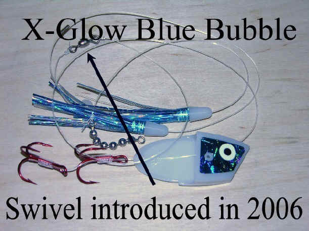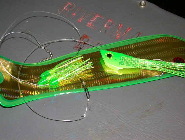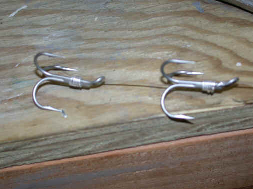 website. Note: This page was first published in 2003, and several pieces are parts might have changed. Constantly updating technology when a better way is found is only natural. I now tie directly to the swivel, eliminating the loop knot. Step by Step Instructions 1. Ever so carefully put a slight bend in the treble hook. 3. Insert thru meat head and install a small crimp in the very tail section of the bait holder. 4. Measure the same original distance to the last fly and tie an overhand loop knot. 8. If there is a drawback to this hook setup, it's gonna be tough on the meat strips. 9. Buy a back-brace to cut down on injuries from hoisting the heavy fish boxes, you're sure to have with the ultimate hook setup on a meat rig. 10. Practice a lot of catch and release, so you won't hurt yourself from hauling 200 pound plus boxes to the cleaning table. 11. Take up golf so you'll have something to do with all the extra time you're gonna |