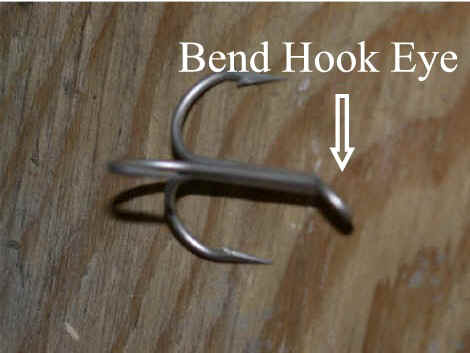 You must carefully bend the eyelet of the VMC 1/0 hook ever so slightly, similar to a turned up eye single Salmon hook that everyone is familiar with. This allows for the hooks to hang straight and not have an offset bend to the leader. The bend will allow the line to lay parallel to the shank of the hook. So, when Mr. Sal Maniod