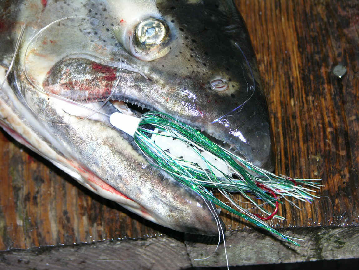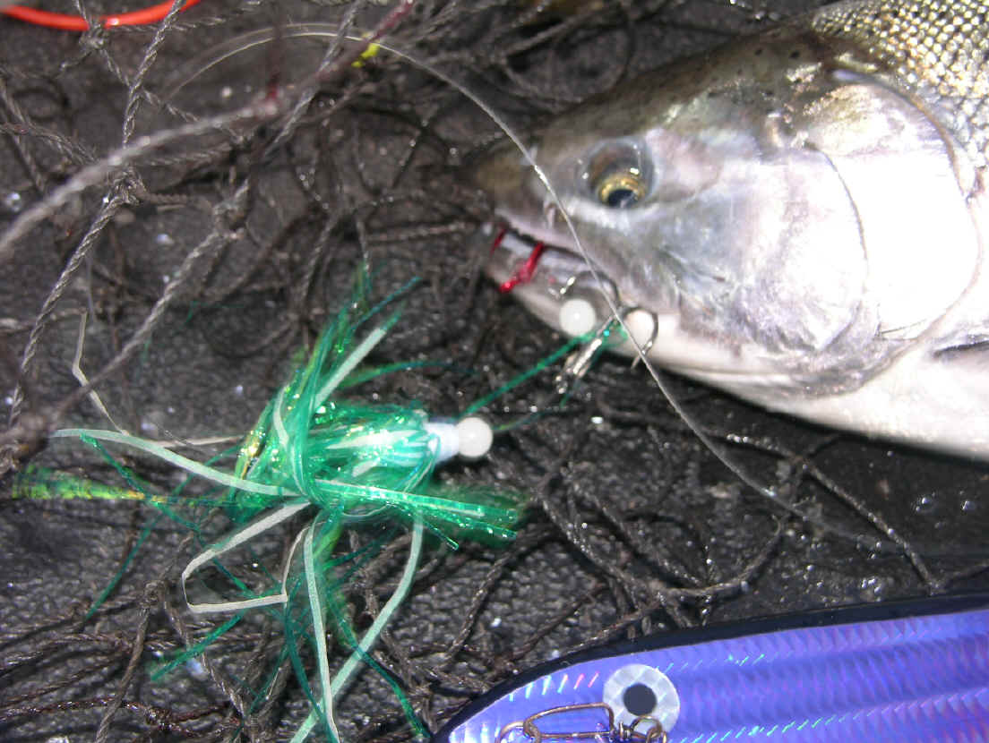 Double Your Pleasure, Double Your Fun! Missing hits on flies is now is a thing of past since we changed over to double snelled trebles. On 8/31/08 we boated let's say ...one fish out of 4 diver bites. 9/2/08 we wised up and changed over to all double snelled trebles on our flies, same as on our meat rigs. We didn't miss any hits on our divers hits that day, or the 3 diver whacks on 9/25/08. Not hooking up hits on our trolling flies is now ancient history since we went to all double snelled trebles on our trolling flies.
