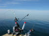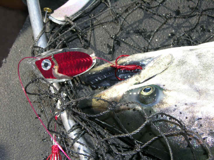 Snippets 1. Extra sharp hooks, pay attention to this important part of your weaponry. Off peak bite will afford opportunities at the rate of 2 maybe 3 bites an hour if you're over fish. Learn to turn hits into boxed fish with focusing on details. 2. Mid day fish will generally be deeper cold water fish in temps from 44 to 38 degree and semi lethargic. Meaning your adversary will not run down a meal that looks to hard to eat. Slow troll from 1.5 to 2 mph will aid in tantalizing your target species. 3. Mid day is when the wind picks up. It's easier to do a long downwind troll with the waves at your stern. If you've located a good 2 mile piece of water it's a lot quicker to pick up lines and travel to the original point of beginning. Getting speed right will be a heck of a lot trouble-free to duplicate rather than trying to fight a head sea. Plus, a bunch more comfortable for you and your crew. 4. Set a goal, or a point to travel to in an effort to cover water. Some of this is for exploration purposes to sort out the fish holding water and depths before retracing unproductive routes. Avoid doing the same thing twice, double true if it's not working. Look at it like I do, if all I'm doing is making mistakes, let's make a brand new. Meaning a new tact, one not influenced by recent past performance issues. 5. Less stress is involved, cuz you're not going to be playing dodge boats that will dictate your trolling path. Lead core and copper? This is the time for this long distance program from the boat. Not when there's a ton of boats waiting to saw you off. 6. Do not crowd a lot of riggers all in the same approximate depth. We try to maintain a 15' depth separation on our 3 rigger spread. Mid day fish cruising for a meal can be turned off by too much stuff. Then stagger the leads with the deepest rigger have the shortest lead from the cannon ball and gradually increase the distance on the rigger that are higher. Our center rigger is the always the deepest with a 10 to 15' lead, next higher will have a 20 to 25' lead and our highest rigger will be back 30 to 40'. What's just been mentioned works if you concentrating on depths from 80 to 120 down. If you have to go deeper, tighten the all leads up more to like 10 to 12 feet if you're working the 150' to 200' depths. These deep Capt. Nemo fish taint all that fussy. 7. Use north/south
