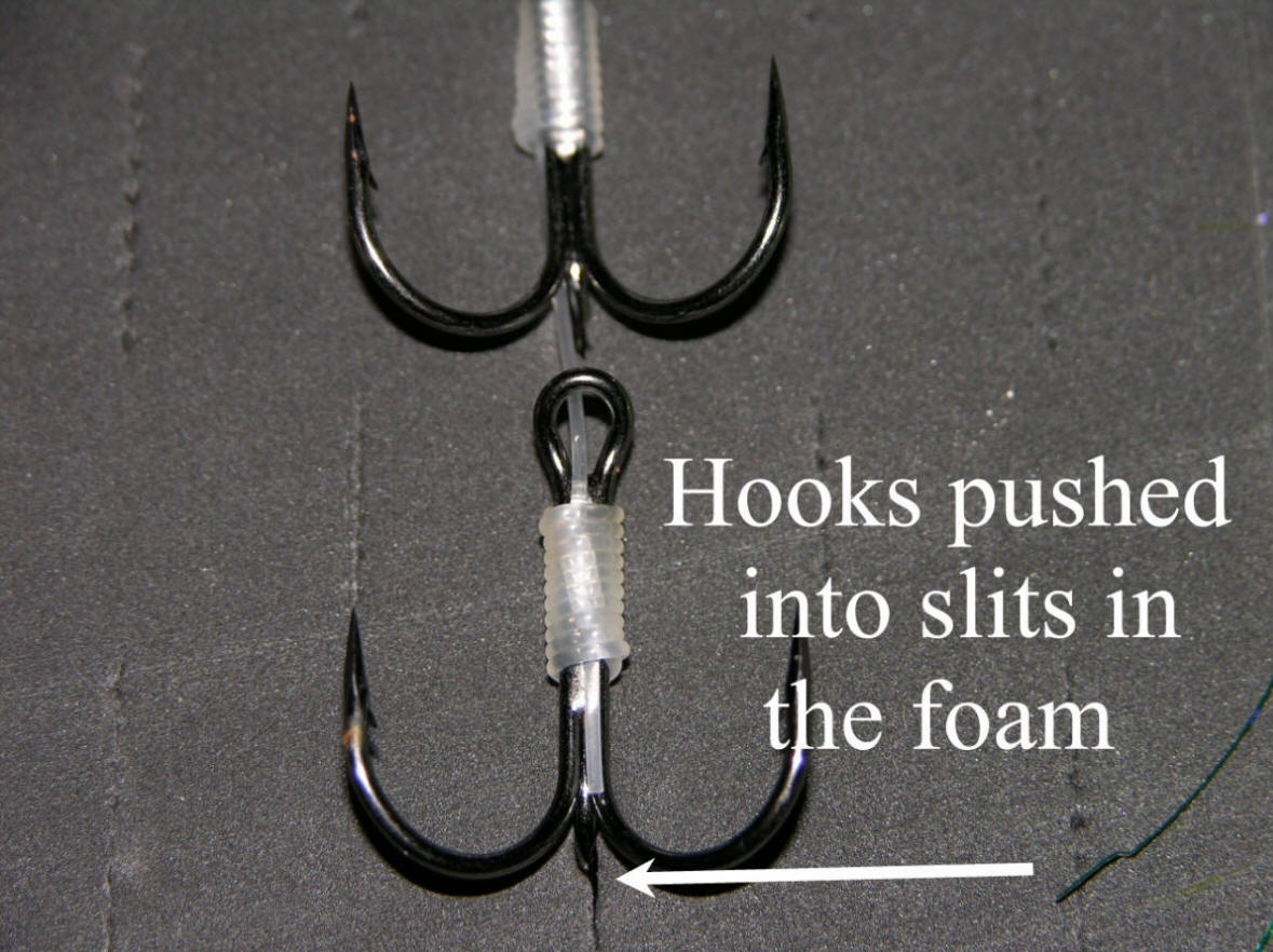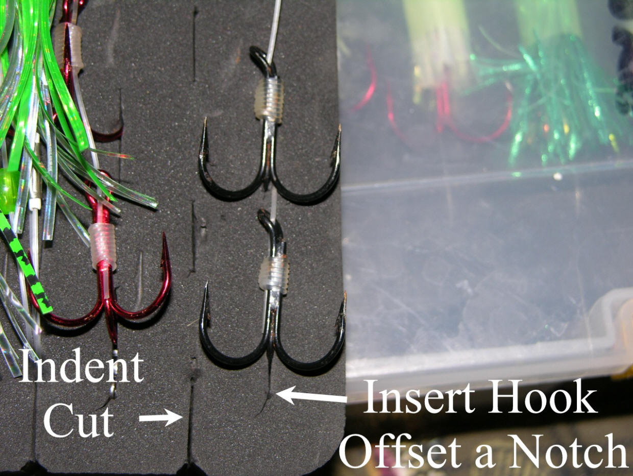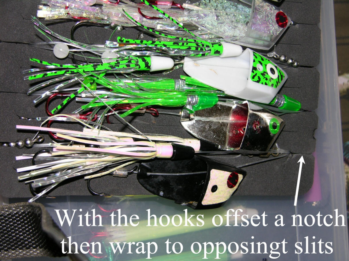 Loading Meat Rigs Load the foam inserts as pictured. Then, place the bottom inserts face down and the top inserts goes face up. This no hooks are touching and either foam insert/leader holder can be accessed easily. Keeping in mind all hooks must be loaded in the normal face up position and on the same side as the meat heads. Just press the hooks into the foam at a slight angle, then it's a straight wrap to tame the leader on the meat rig. Take your time loading and the rewards will far exceed what I charge at the webstore for this awesome storage solution.
