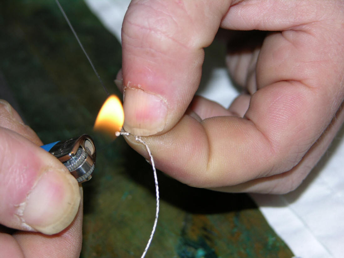 never slip. Spectra fibers melts at 152 degrees Celsius. Melting can be done with a good hot soldering iron too, but matches and lighters should be onboard for jobs like this, or melting ferrule cement for gluing rod tip-tops back on. Protect the knot with your thumbnail and let a lighter, or a match singe/melt the ends together. Keeping in mind all Spectra Fiber line is woven like cable from many tiny threads. Not melting these ends will result in a raggedy fanned-out frayed looking knot tag end. |
