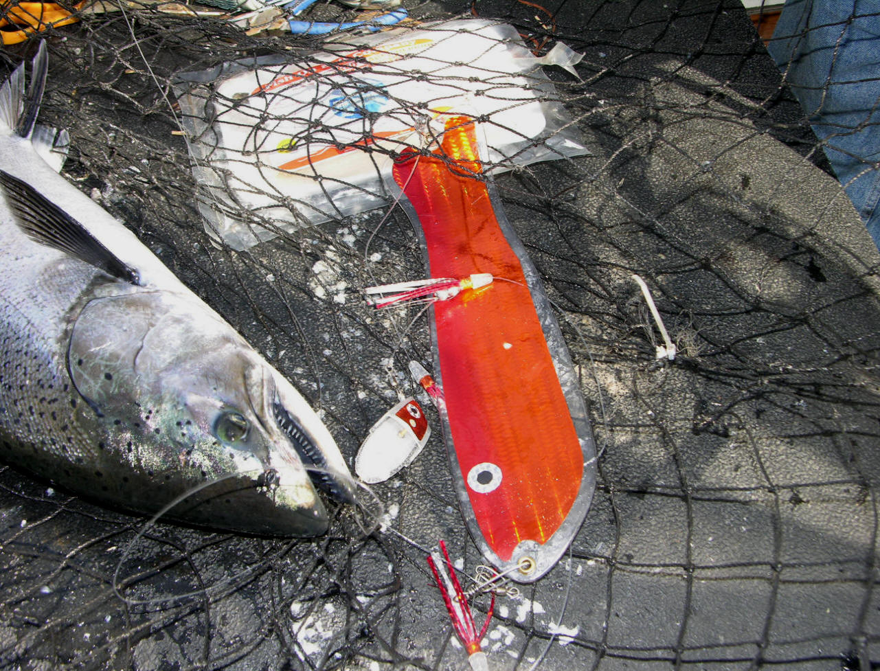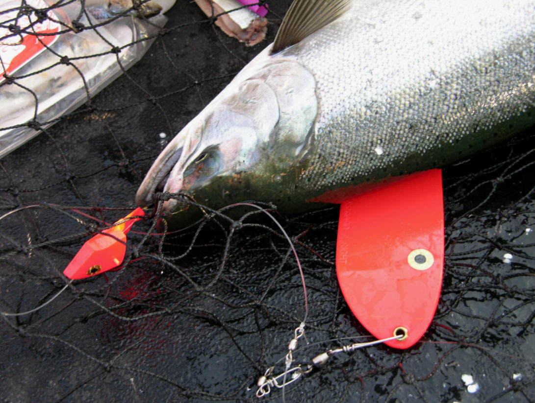 Breaking white light into who know what down at a 100'. Lest not forget microwaves that fall in between IR and radio waves. None of this stuff amounts to a hill of beans surrounding the reel-facts about Great Lakes fish actually seeing red. For all we know fish vision can be superior ours and quite possibly see into the infrared and UV bands of the spectrum. Are you of the mindset that thinks scientific principles can be applied to the unsolvable eternal mystery of fishing? Please let me remind you of the infinite amount of variables that rarely, if ever can be duplicated. Snippets 1. Not a fleet-wide accepted color, red works in your favor. 2. Ex-spurt is a leaky faucet that got fixed. 3. What does red look like to a fish? Who cares just as long as they bite on it. 4. It's long been proven Steelhead, or 'bows prefer fluorescent reds. 5. Fluorescent Red is a long proven Coho killer. 6. Adult male Great Lakes Coho develop deep red sides. 7. Red is used by nature several ways, like drawing mates. 8. Misinformation is spread by those with blatant disregard for common sense and reel-facts. 9. Red is one of the most expensive pigments for paint and same goes for colorants used in plastic injection molding. Maybe the red disappears controversy was a possible preemptive strike to keep production costs low? 10. I've got a fresh crisp 100 dollar bill awaiting anyone who can prove beyond a shadow of doubt, fish cannot see red. Why? ...cuz, there's over 20 photos in both parts of this article that say otherwise. Showing undisputable photographic proven evidence of red jaw jewlery. Click for part 1 & 2010 Leland Puke BTI Flasher Info Looking to purchase tackle that works? Then click here!