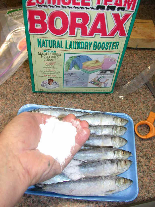 Photo 5. This it the simple deal of letting the bait thaw for about an 1/2 hour. I don't let it set out too long as not to dry the tail fins out, which will become a huge asset in my book. Please take note of the faint white lines on the bait, that's the still frozen herring oil. Photo 6. Sprinkle the herring liberally with a goodly handful of 20 Mule Team Borax which helps set the scales. The scales is where the color, or shine is held. You don't want to lose any more scales then necessary. Photo 7. After the bait is covered with 20 Mule Team Borax, a matching handful of Kosher, or pickling salt is added. This is not rocket science, so handfuls work for me. If you feel it's a necessity to measure the ingredients it's a 1/2 cup of Borax and a 1/2 of the Kosher salt. Photo 8. Then I put the whole deal in a gallon Zip-Lock bag. Use only the high quality Zip-Locks, the extra pennies is worth then worth it. 5/26/09 Update: I no longer use a zip lock and found a pickle jar offers better protection. With less chance of leakage. This article was first penned in 2004 and need to update the storage method we're using now. |