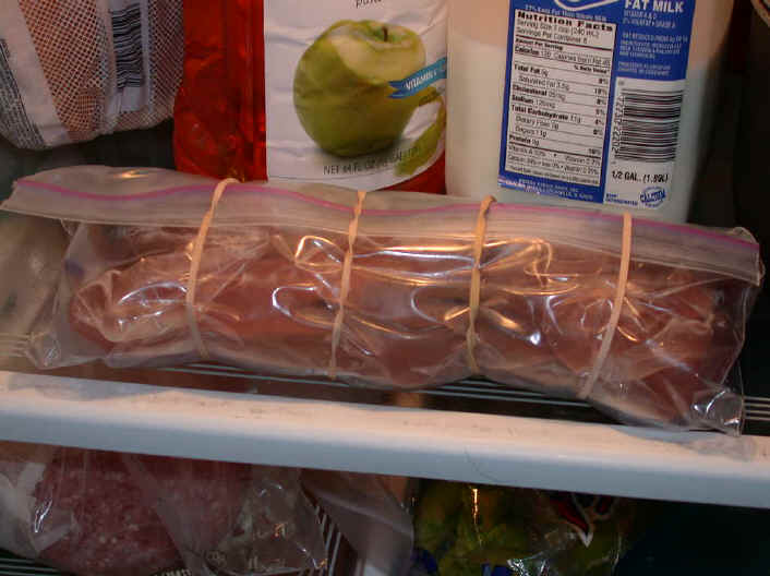 Photo 17. This image shows in great detail what the "A" side looks like after it's trimmed to a little over an inch. The overall length should not exceed 6 inches. If it does?.....it might not spin properly. Trim the front part of the bait on an angle to match the bait head holder. Photo 18. This what the trimmed herring fillet is gonna look like and I always have a spare bait head handy to make sure it fits just right. Please note most of the scales are still attached. Now, this is what Reel-Salmon meat is supposed to look like. I'm sure you'll agree to the irresistible natural presentation of the outward appearance of this bait! Photo 19. This is the "B" side. You'll see the top and bottom have been transposed, but never the less the Salmon still chomp on it. With me it's the personal preference to the "A" side, however results with the "B" side seem to be pretty darn close to the "A" piece. Photo 20. Please examine this photo very closely. I took this image to show you what 24 cut pieces of Salmon bait look like before it goes into the special brine mix. You can see the original baggie of brine, or juice I started the thaw process in this photo. Be sure to save that stuff....it contains the herring oil and initial juices (smell) from the herring. Be do the work yourself the savings will amount to about 70% of purchasing the commercially prepared stuff. I'd also guesstimate self-prepared herring strips out-fish the commercial stuff by at least 50% from my experience from what I seen in fair head-to-head tests on the boats I was on. It wasn't that we didn't catch fish on the commercial 6 strips in a tub, we caught more on the homemade herring. Tip: Put the cut-up herring in a Zip Lock gallon sized baggie in the same baggie you started this process out of. Do not discard the original fluid, because it have has the herring oil in it. Never rinse the fillets either, it is essential not to overlook this step. Let your hands get gooky and leave the fishy smell on your paws. Scent is the deal! I use a paper towel if my hands get too messed up. |