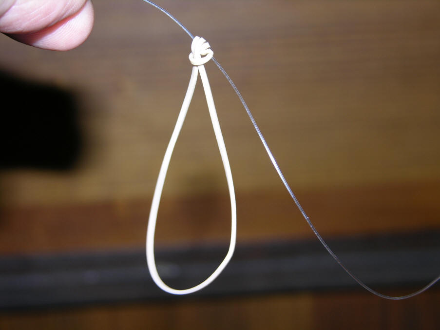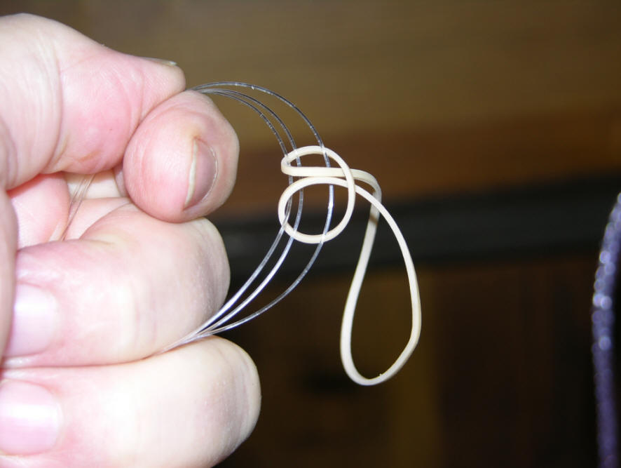 2. Half-hitch a rubber band thru the 3 loops you just made 3. Snug up the loops by pulling on the rubber band, until it's tight! 4. insert and clip into a Black's Downrigger Release A. Blacks Rigger Release adjustable